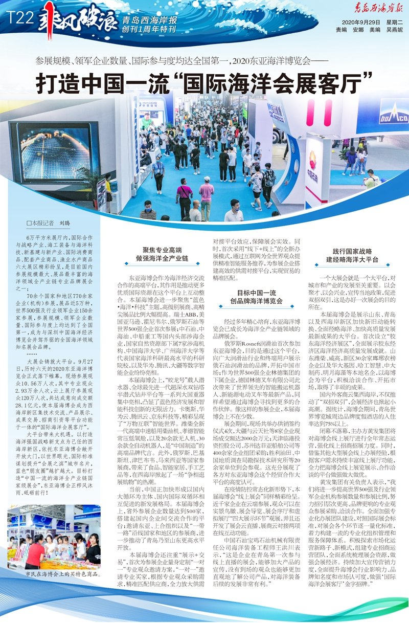 大展會鑄就大平臺。9月27日,歷時六天的2020東亞海洋博覽會正式落下帷幕。現場參展觀眾10.56萬人次,其中專業觀眾2.93萬余人次,云上展廳參展觀眾120萬人次,共達成意向成交額28.1億元,使本屆海博會成為西海岸新區集技術交流、產品展示、成果交易、招商引資等平臺功能于一體的“國際海洋會展客廳”。